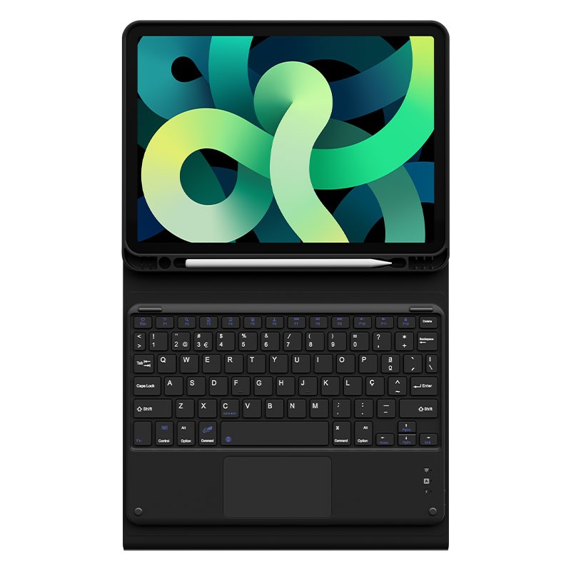 Além de ser fácil de usar, esta Capa iPad possui um teclado mecânico com touchpad bastante resistente, indicadores luminosos Bluetooth, Caps lock e indicador de carga. Encontra ainda na lateral direita do teclado o botão on/off e uma porta de carregamento UBS-C (cabo USB-C incluído). Esta Capa iPad Air inclui ainda um espaço para colocar a Caneta iPad.